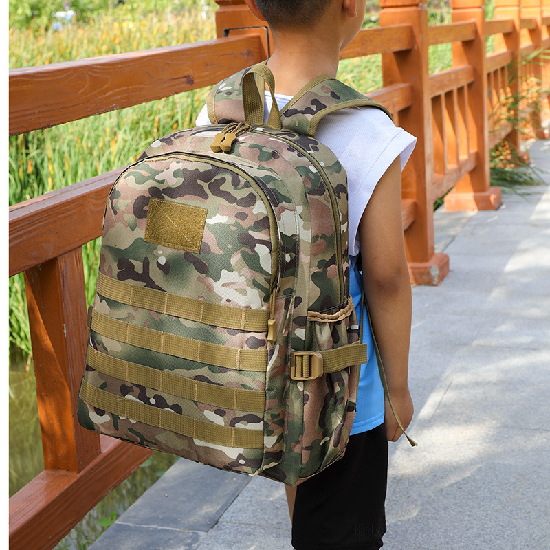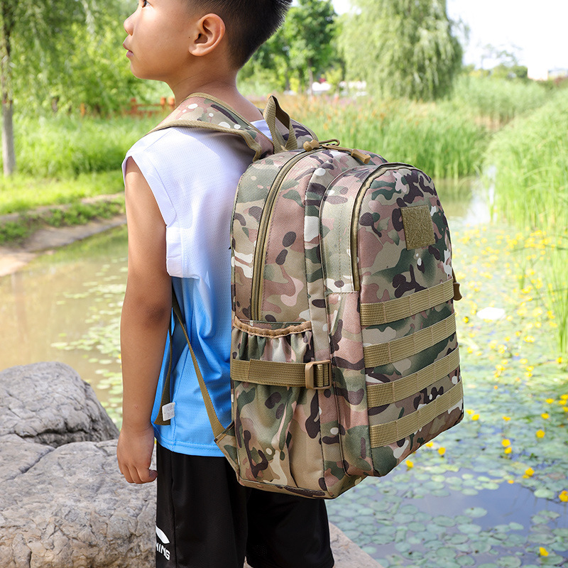 アウトドアでの冒険にぴったりな迷彩柄デザインの子どもリュックです。